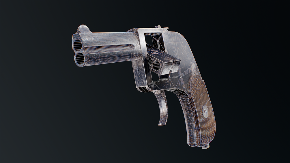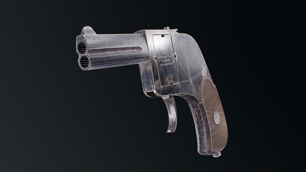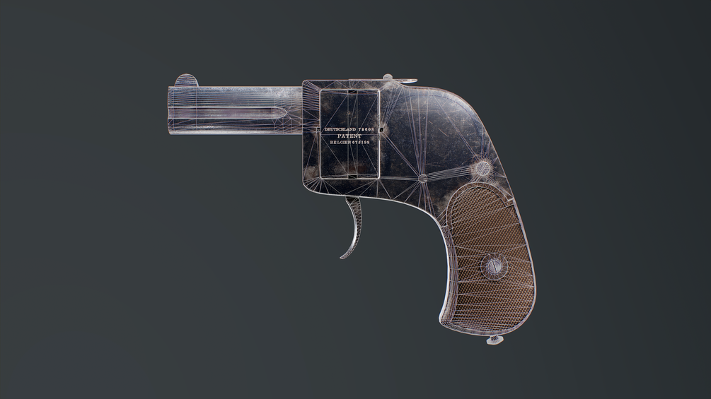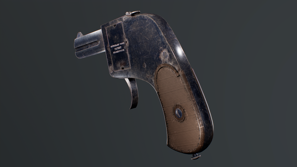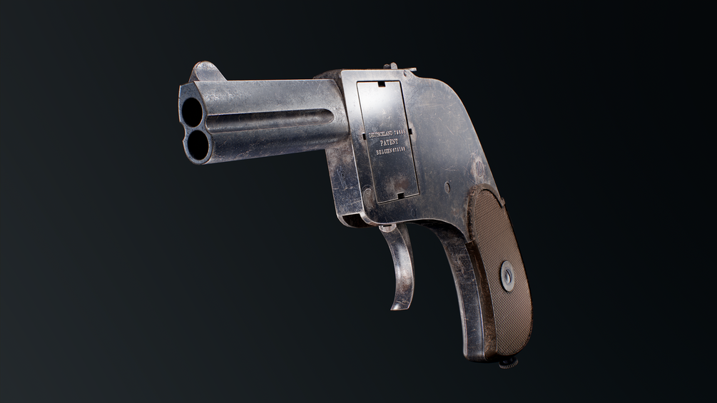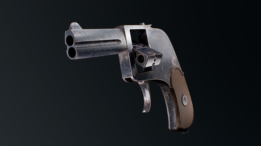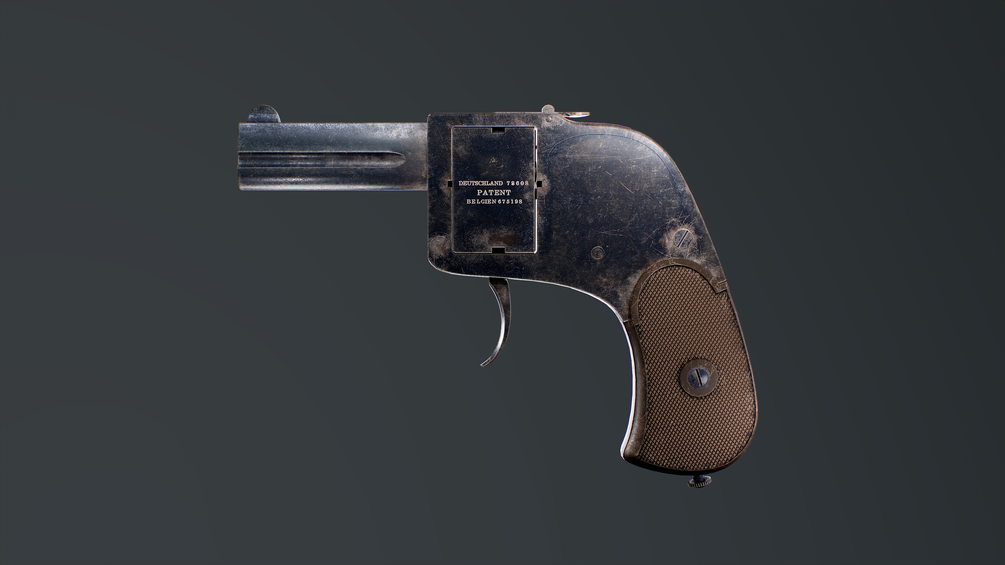 A rather simple pistol, the Bär is a double-action only pistol with a compact form factor. The weapon feeds from a rotating cylinder block which holds four rounds; pushing a button on the top of the gun allows one to rotate the block around. The weapon has two barrels.